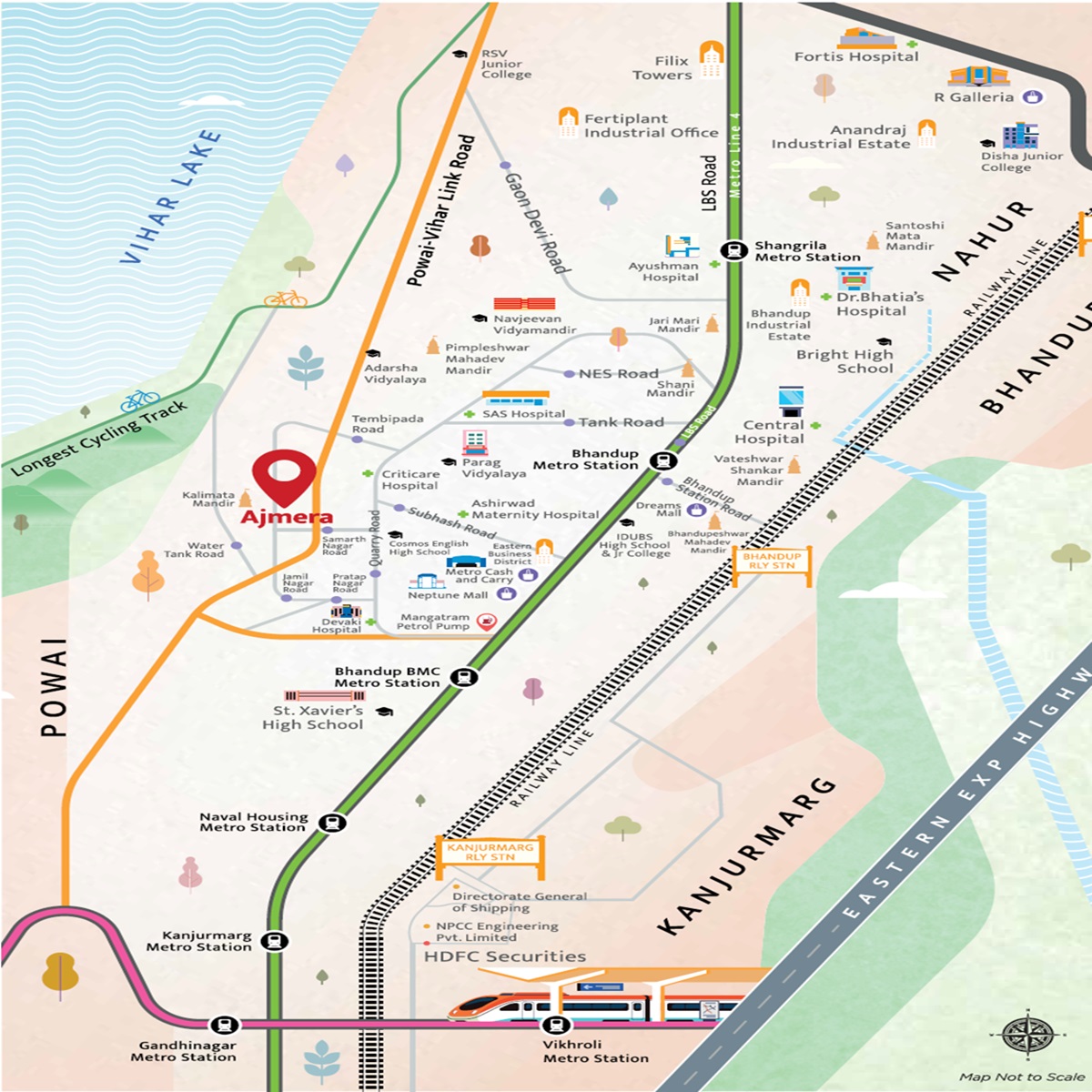 Ajmera 78 Lake Town, a unique residential project located in the heart of Bhandup West, is strategically connected by two major roads - Eastern Express Highway and LBS Marg. This makes it an ideal location for those seeking a peaceful yet easily accessible lifestyle in the eastern suburbs of Mumbai.