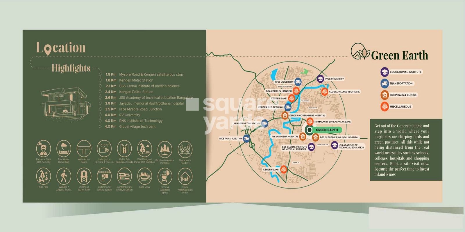 Introducing Annragh Green Earth, a premier residential project located in the heart of Sunkalpalya, connecting Mysore Road N R Road and NICE Peripheral Ring Road, making it easily accessible from all parts of the city. This eco-friendly project offers a serene and peaceful living experience, surrounded by lush green surroundings. Residents can enjoy a range of modern amenities, including a well-equipped gym, 24 x 7 security, and rainwater harvesting, ensuring a safe and sustainable living environment.