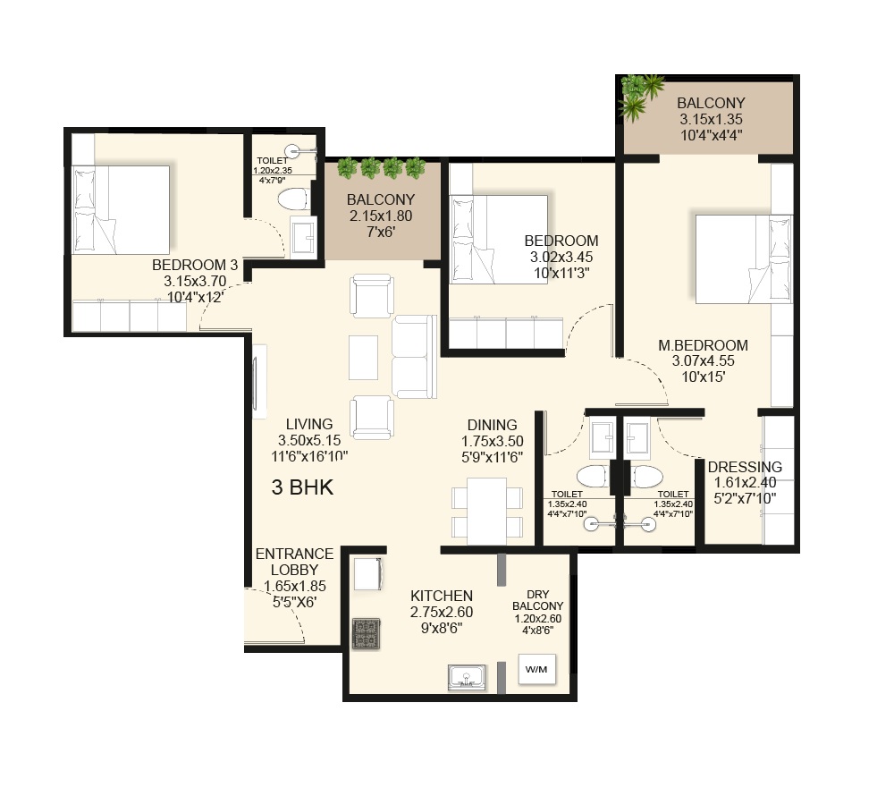 | 3 BHK Apartment | 1150 | 1.35 Cr |