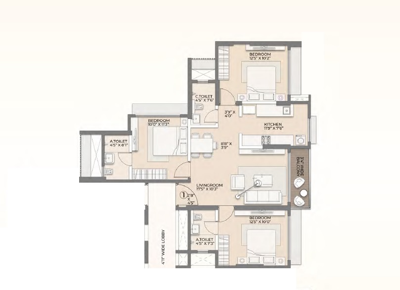 | 3 BHK Apartment | 847 Sq. Ft. |