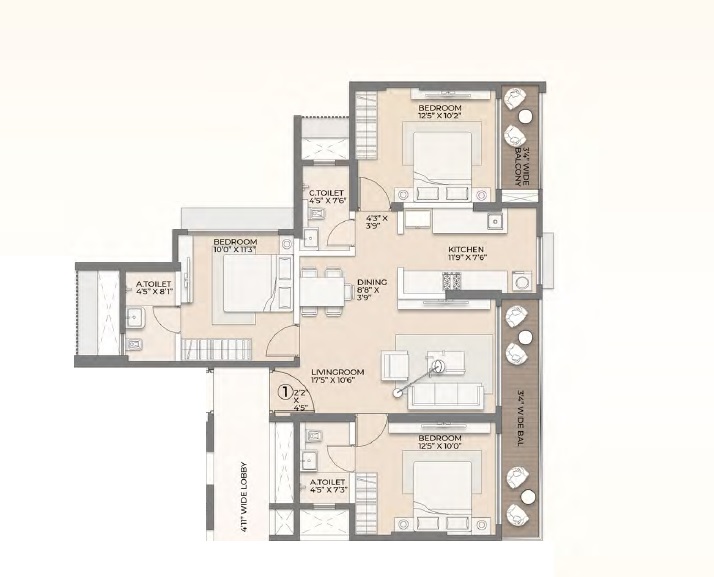 | 3 BHK Apartment | 963 Sq. Ft. |