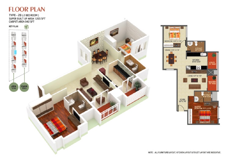 The project features spacious and stylishly designed apartments, with specifications that include master bedroom flooring featuring vitrified tiles. The 2BHK and 3BHK apartments are available in various sizes, ranging from 1265 to 1885 square feet, with prices starting from 33.52 Lac to 49.95 Lac. These units offer a perfect blend of comfort, convenience, and style, making them an ideal choice for homebuyers seeking a relaxed lifestyle.
