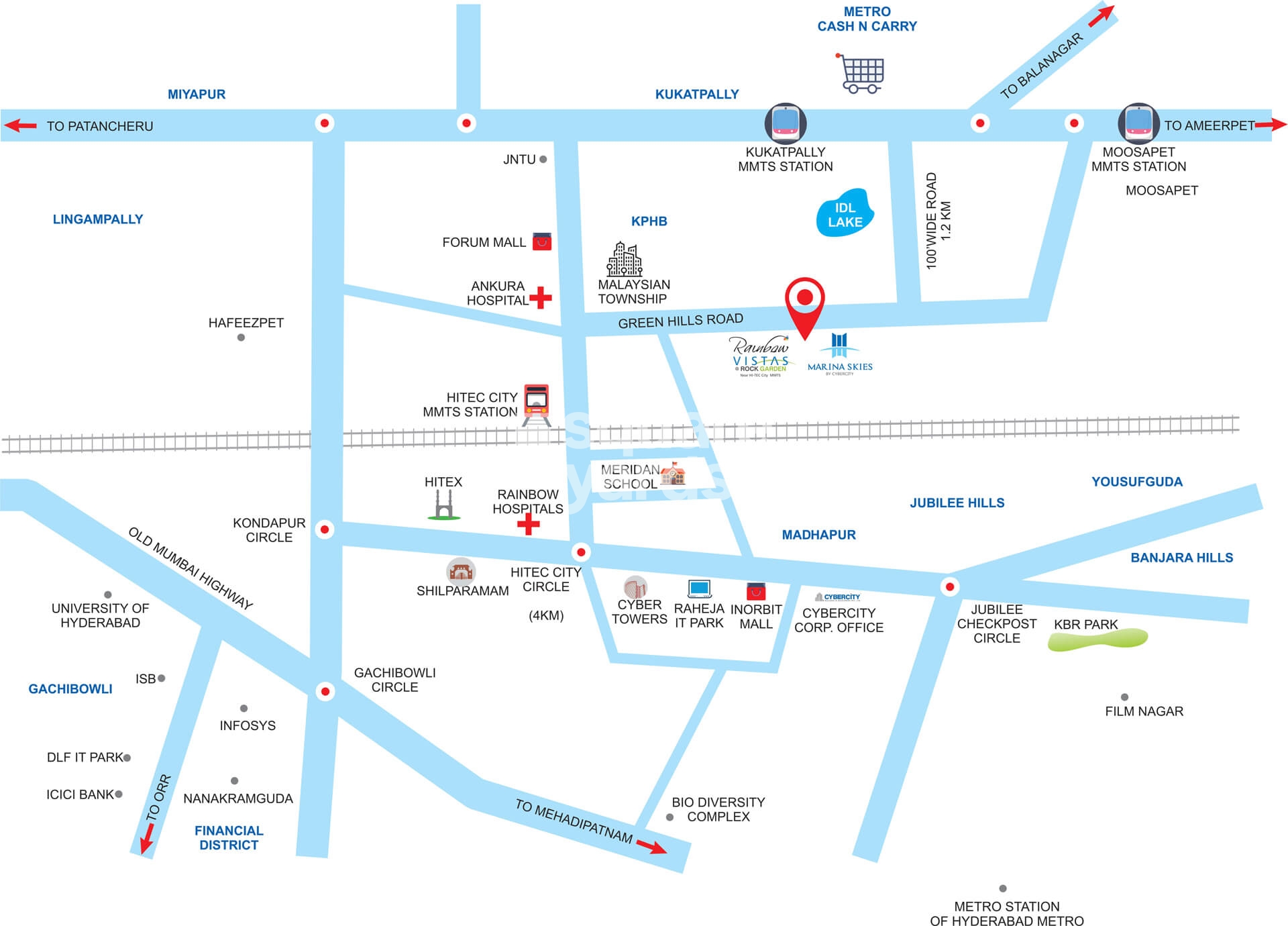 Welcome to Cybercity Rainbow Vistas a prestigious real estate project by Cybercity developers located in Hyderabad This IGBC gold rated project is a haven for those seeking harmonious living in a stressfree environment Designed as a selfcontained integrated city within a city Rainbow Vistas offers a perfect blend of residential commercial and leisure spaces The project follows the LiveWorkLearnPlay concept ensuring that everything you need is just a short walk away The convenience of having workplaces educational institutions and recreational facilities within easy reach saves you time money and unnecessary stress Set in a sprawling 68acre layout Rainbow Vistas boasts exceptional features such as avenue plantations lush landscaping and verdant open spaces With 60 open area and two picturesque lakes the project ensures a serene and tranquil ambiance Residential units are strategically interspersed with commercial establishments such as malls multiplexes banks and hotels providing easy accessibility to all the essentials of urban living Location is paramount when it comes to real estate and Rainbow Vistas Rock Garden does not disappoint Situated near the HITEC City MMTS station this project enjoys a prime location in an elite neighborhood It is centrally located with easy access to bluechip companies financial businesses and major residential hubs The wellconnected road network ensures hasslefree commutes and an array of restaurants cafes and entertainment options are in close vicinity Rainbow Vistas Rock Garden offers elegant apartments that are designed for a luxurious and comfortable lifestyle Standing tall with 20storeyed apartment complexes the 2500 spacious units provide ample space for modern living The apartments are aesthetically designed with impeccable interiors breathtaking views and a perfect blend of functionality and aesthetics In adherence to Vaastu principles each unit is wellventilated and receives an abundance of natural light contributing to energy savings The project also boasts impressive amenities and facilities for residents to enjoy The clubhouse spread over 100000 sq ft is perched atop a rocky hill and offers a breathtaking view With recreational options for all ages its the perfect place to relax and rejuvenate In addition to the clubhouse Rainbow Vistas Rock Garden features landscaped parks with fountains and water bodies wide blacktopped roads lined with avenue plantations and a proposed retail and commercial space Investing in Rainbow Vistas Rock Garden is an opportunity to embrace a wholesome and luxurious lifestyle surrounded by modern conveniences With elegantly designed apartments premium amenities and a prime location this project is truly a destination for a harmonious and fulfilling living experience