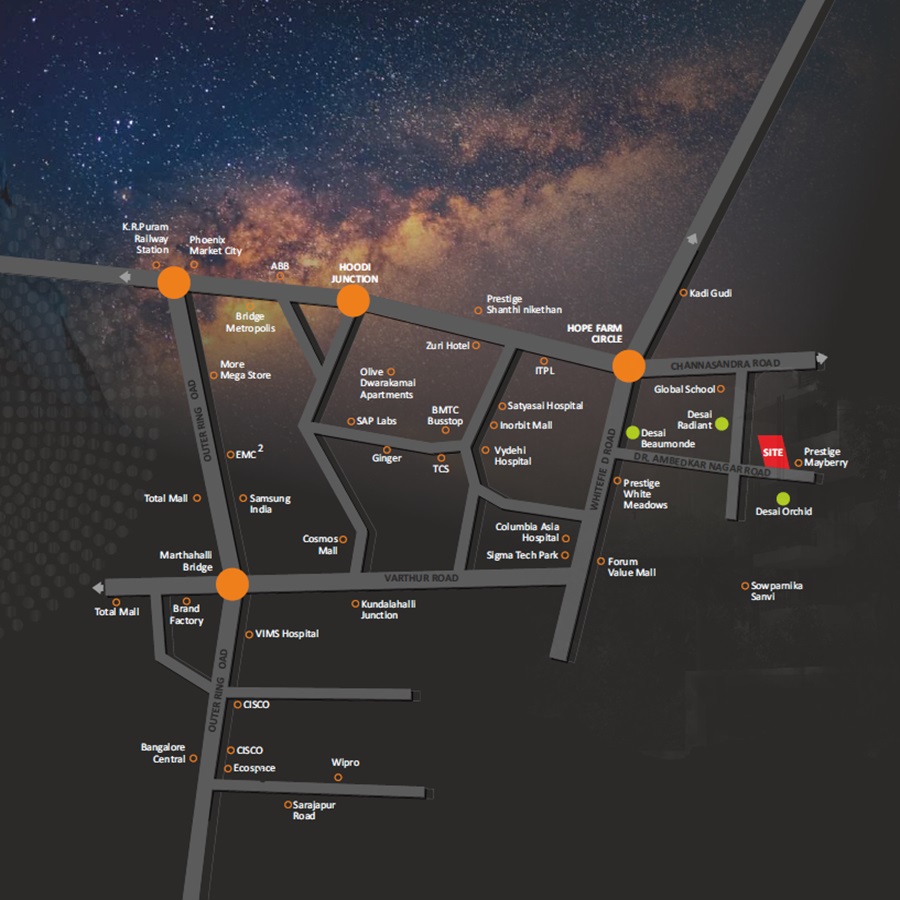Introducing Desai Grandeur, a luxurious residential project located in the heart of Whitefield, one of Bengaluru ' s most sought-after neighborhoods. This project presents a unique opportunity to live in a vibrant community surrounded by world-class amenities and unparalleled connectivity. With proximity to the Dabaspete Hosur Highway, just 3.4 kilometers away, and the Whitefield Main Road, just 0.2 kilometers away, residents can enjoy ease of access to major commercial hubs, educational institutions, and healthcare facilities. Add to that the thrill of living amidst lush green surroundings and breathtaking views of the city, and you have a project that truly stands out from the rest.