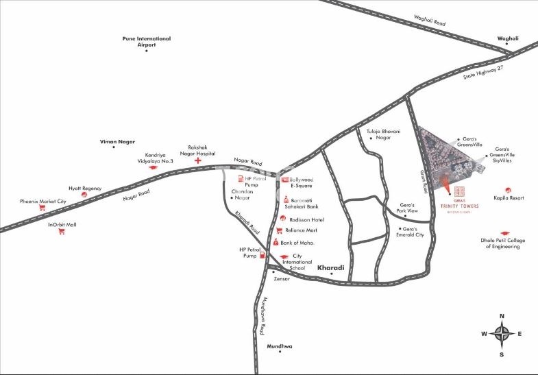 Experience the best of Kharadi at Gera Trinity Towers, strategically located off Nagar Road. This magnificent residential project brings together the perfect blend of luxury and convenience, making it an ideal abode for families and individuals alike. The project ' s proximity to major educational institutions, IT parks, and entertainment hubs ensures a seamless and modern lifestyle.