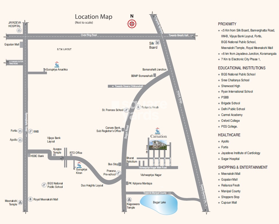 Experience the essence of luxurious living at Gurupriya Carnation, a stunning residential project located in the coveted suburb of Begur. Strategically nestled near the important connecting roads of Hosur Road** and NICE Peripheral Ring Road**, this project offers unparalleled convenience to commuters, providing seamless access to various parts of the city.