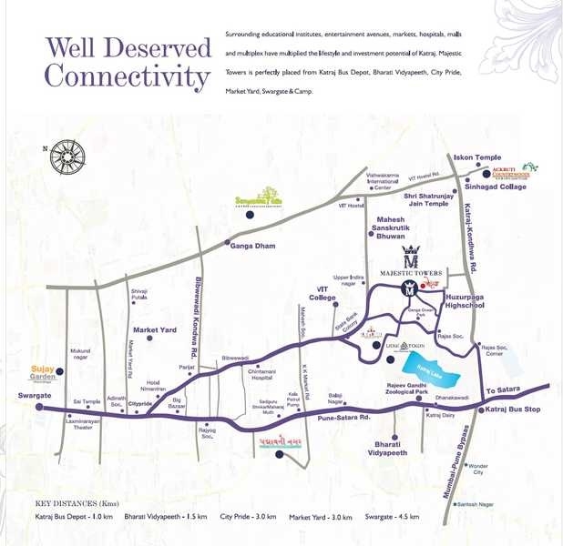Jairaj Majestic Tower is a premium residential project situated in Pune South, Pune. The project offers 118 units spread over 5.5 acres of land, comprising 2 and 3BHK apartments, with sizes ranging from 1220 sqft to 1585 sqft. The project is strategically located close to schools like as Huzur Paga School, Surrounding educational institute, Entertainment avenues and malls such as Golden Topaz mall,Easy to accessibility Katraj bus depot, Bharati Vidyapeeth, Swargate and Camp. The project is closed proximity to hospitals like Mulund, Ghatkopar, and Shivajinagar and is just a few minutes walk from the Pune-Mumbai Expressway. The project is well-lit and has 24-hour security. Jairaj Majestic Tower offers an excellent investment opportunity with excellent returns.