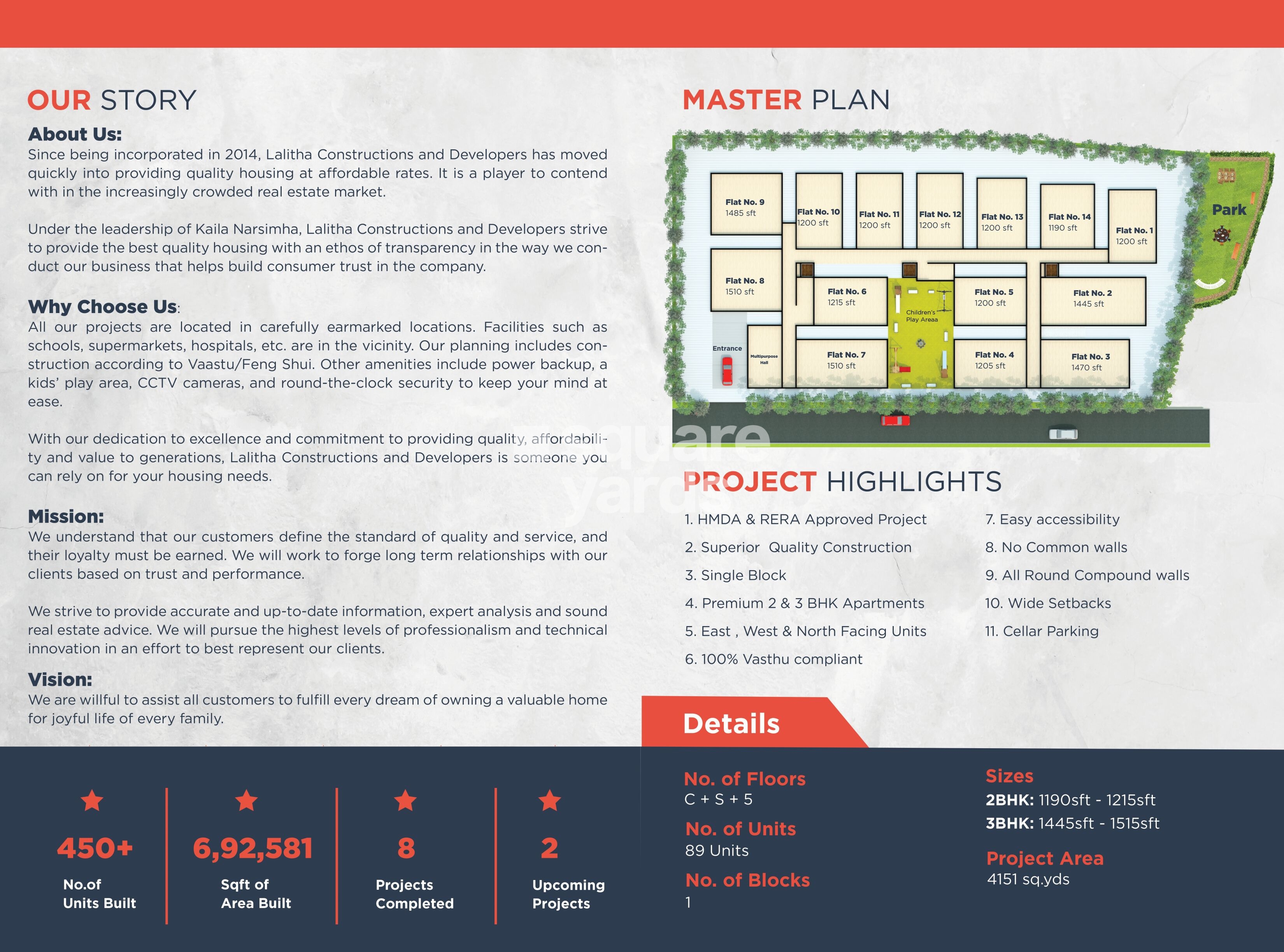 Lalitha Mejastic is a perfect place to call home, with its contemporary spaces that are a good combination of comfort and convenience. The project offers 65 units spread over 2 acres of land, with sizes ranging from 1190 sqft to 1485 sqft. The project is located in the West Zone of Hyderabad, close to Ameenpur Lake and easy access to Smt Geetha bhoopal reddy junior College. It is also well connected to NH 65.