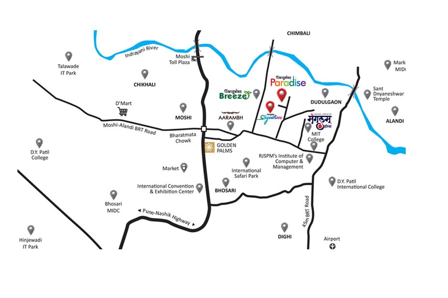 Mangalam Paradise is a well designed apartments project located in Pimpri Chinchwad PCMC,Pune. The project offers 123 units spread over 0.62 acres with sizes ranging from 1 BHK to 2 BHK. The project is well connected to Bhosari MIDC and Chakan MIDC and is close to DMart. The project is also well connected to Pune-Nashik Highway.