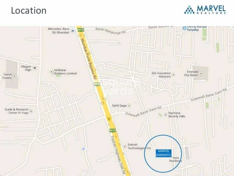 Marvel Sorrento, a residential project located in Baner, offers a unique blend of luxury and convenience. The project is strategically connected to Gopal Hari Deshmukh Marg and Pune Bypass, making it easily accessible from various parts of the city.