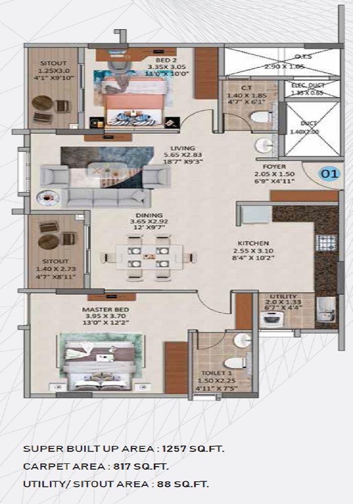 With a range of unit options available, Oceanus White Meadows offers something for every lifestyle. Choose from 2 and 3 BHK apartments, ranging from 1257 to 1845 sq. ft. in area, and priced competitively starting from 90.00 Lac. Whether you ' re a young professional, a growing family, or a retiree, Oceanus White Meadows is the perfect place to call home. Make the most of this incredible opportunity and experience the best of city living with us!