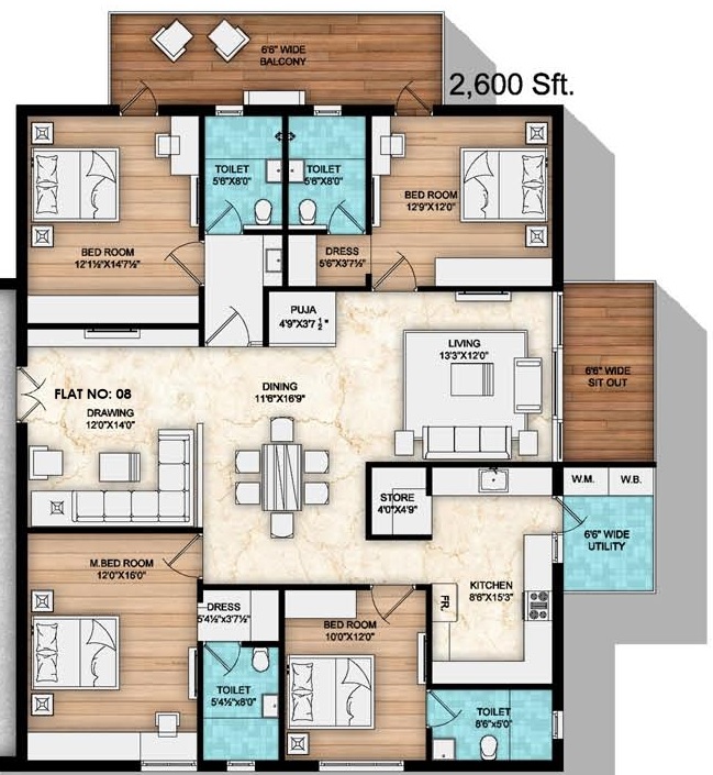 | 4 BHK Apartment | 2600 Sq. Ft. |