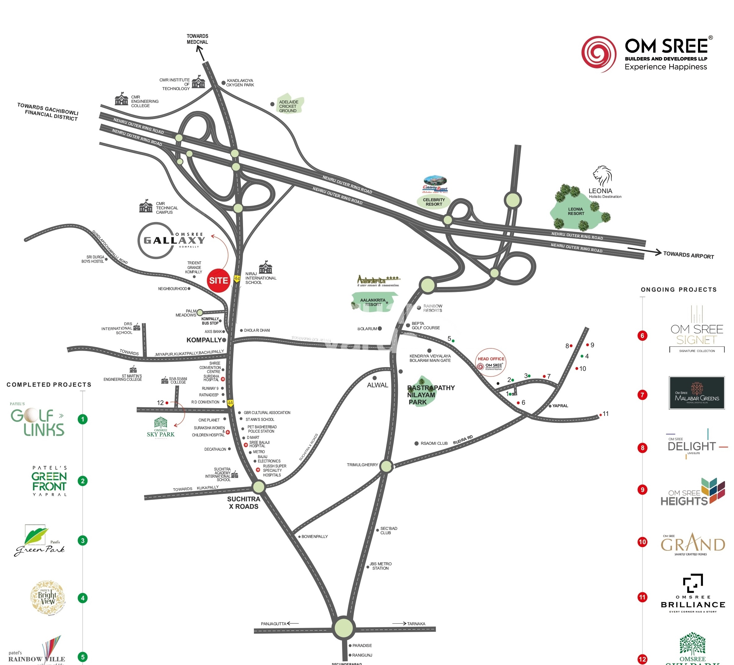 Introducing Om Sree Skypark, a premier residential project located in the heart of Kompally, Hyderabad. Strategically connected by the Nizamabad Road NH 44, this project offers easy access to major landmarks and commercial hubs. With a focus on quality and comfort, Om Sree Skypark is designed to provide a luxurious living experience to its residents.