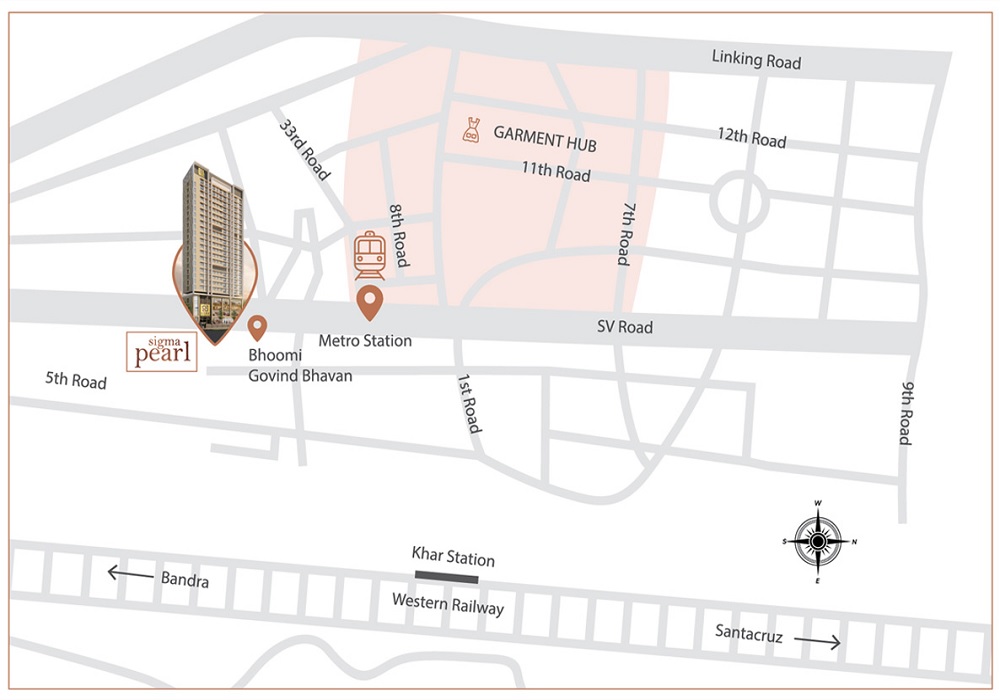 Sigma Pearl is an premium Project located in Khar West, Mumbai Western Suburbs and well connected by major road(s) like Swami Vivekanand Road, Western Express Highway. The total area in which Sigma Pearl has been built is 0.161 acre. This project has been developed by Sigma Realtors India Pvt Ltd who are one of the reputed developers in the Mumbai. The Project current status is New Launch. It has 58 Units