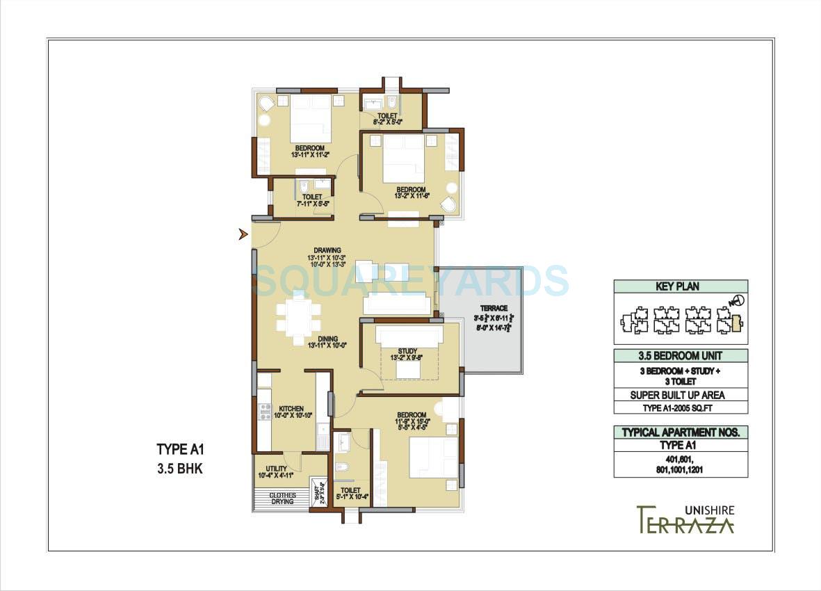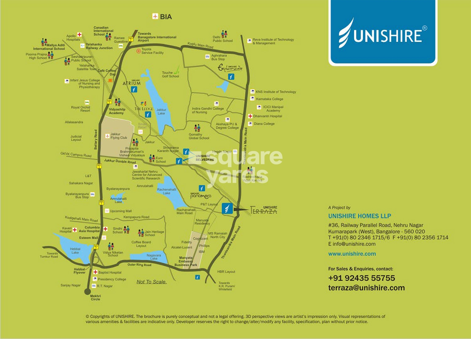 Unishire Terraza is an exclusive Project located in Thanisandra, North Bangalore and well connected by major road(s) like Hennur Main Road, Outer Ring Road. The total area in which Unishire Terraza has been built is 3 acre. This project has been developed by Unishire Group who are one of the reputed developers in the Bangalore. The Project current status is Ready to Move. It has 182 Units. The Apartment units are available in various configurations like 2 BHK Flats at a minimum price of Rs 89.52 L and maximum price of Rs 98.60 L with Property Size ranging from 1430 Sqft to 1575 Sqft, 3 BHK Flats at a minimum price of Rs 1.04 Cr and maximum price of Rs 1.38 Cr with Property Size ranging from 1660 Sqft to 2200 Sqft, 4 BHK Flats at a minimum price of Rs 1.38 Cr and maximum price of Rs 1.58 Cr with Property Size ranging from 2208 Sqft to 2516 Sqft.