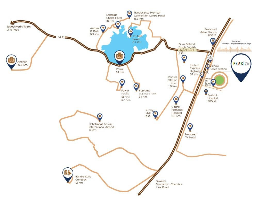 Vaibhavlaxmi Peak 25, a residential project located in Vikhroli East, promises a luxurious living experience. Strategically positioned along the Eastern Express Highway and JogeshwariVikroli Link Road, the project offers seamless connectivity to major parts of the city.