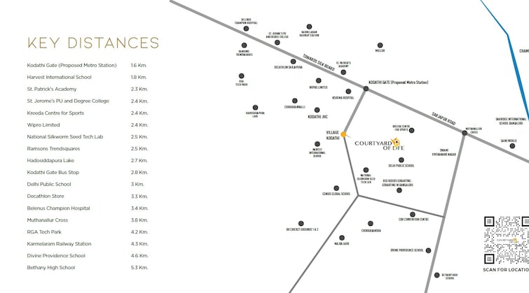 Located in Kodathi Village, Southeast Bengaluru, Courtyard of Life offers a unique blend of urban convenience and natural serenity. This residential haven is strategically positioned near top educational institutions, major corporate hubs, and upcoming infrastructure developments.